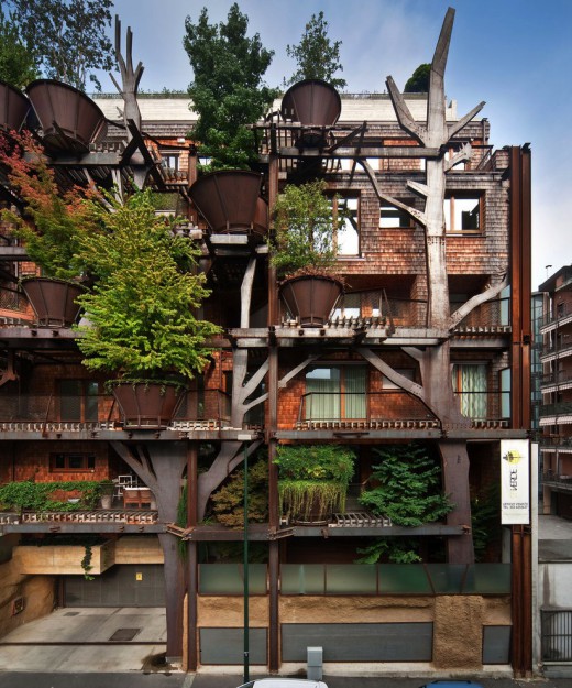 This building is an ecological sanctuary for the tenants, the disguise of 150 trees in pots and steel beams shape reminiscent branches bringing the spectacle to refer to a forest or in a huge treehouse.