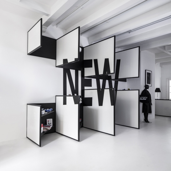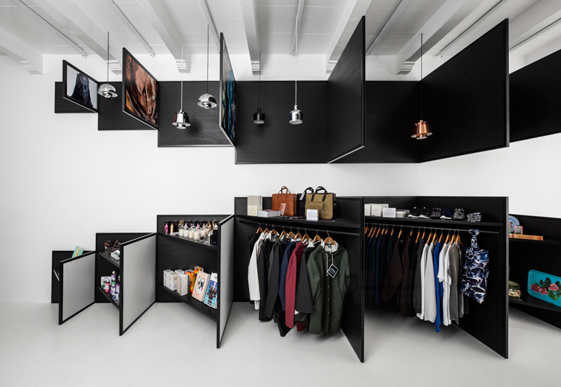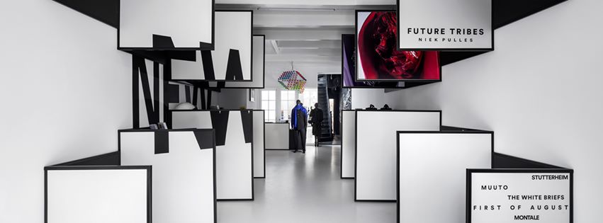 Looking from the inside, from the back of the store, everything seems different. Behind the dashboard are mounted on racks or hangers objects and clothes respectively, in such a way as to create maximum contrast with their environment (eg. black clothes in bright white board). This time the Frame Store hosts the report of Niek Pulles “Future Tribes“.