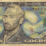 Charles uses ink and color only to rewrite the notes putting aside the value of money using not only dollars of 5 and 10, but 50 and 100. The changes are so subtle and careful and painstaking work with ink looks like it was decorated to look like money – but if you take a closer look, you will find that these tiny canvases are genuine banknotes.