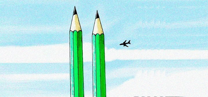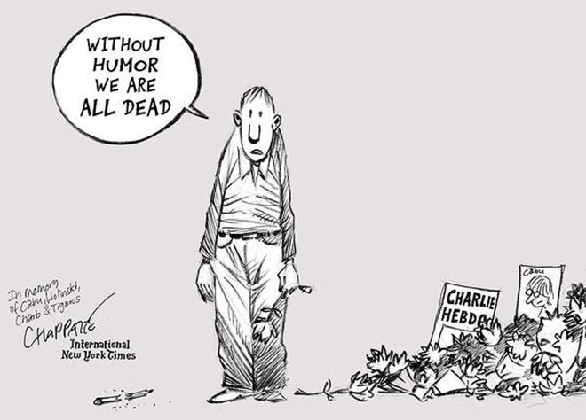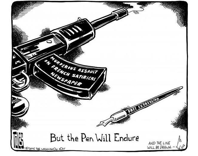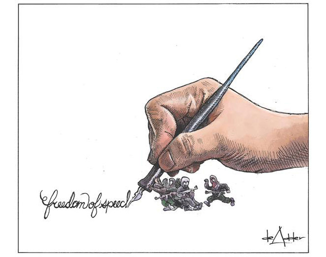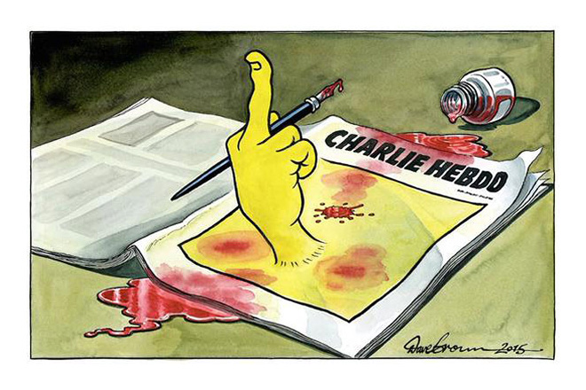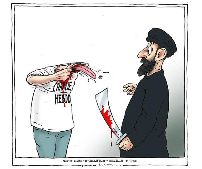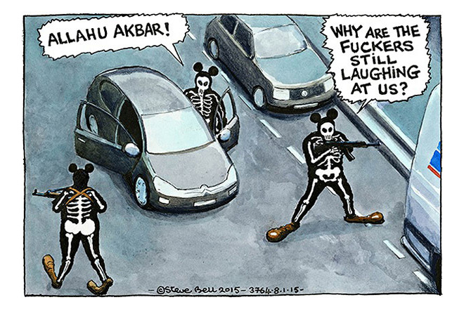 As expected, illustrators all over the world, such as Steve Bell of The Guardian, have honoured their dead colleagues by taking part in the battle for the freedom of speech, which seems more insecure than ever before.