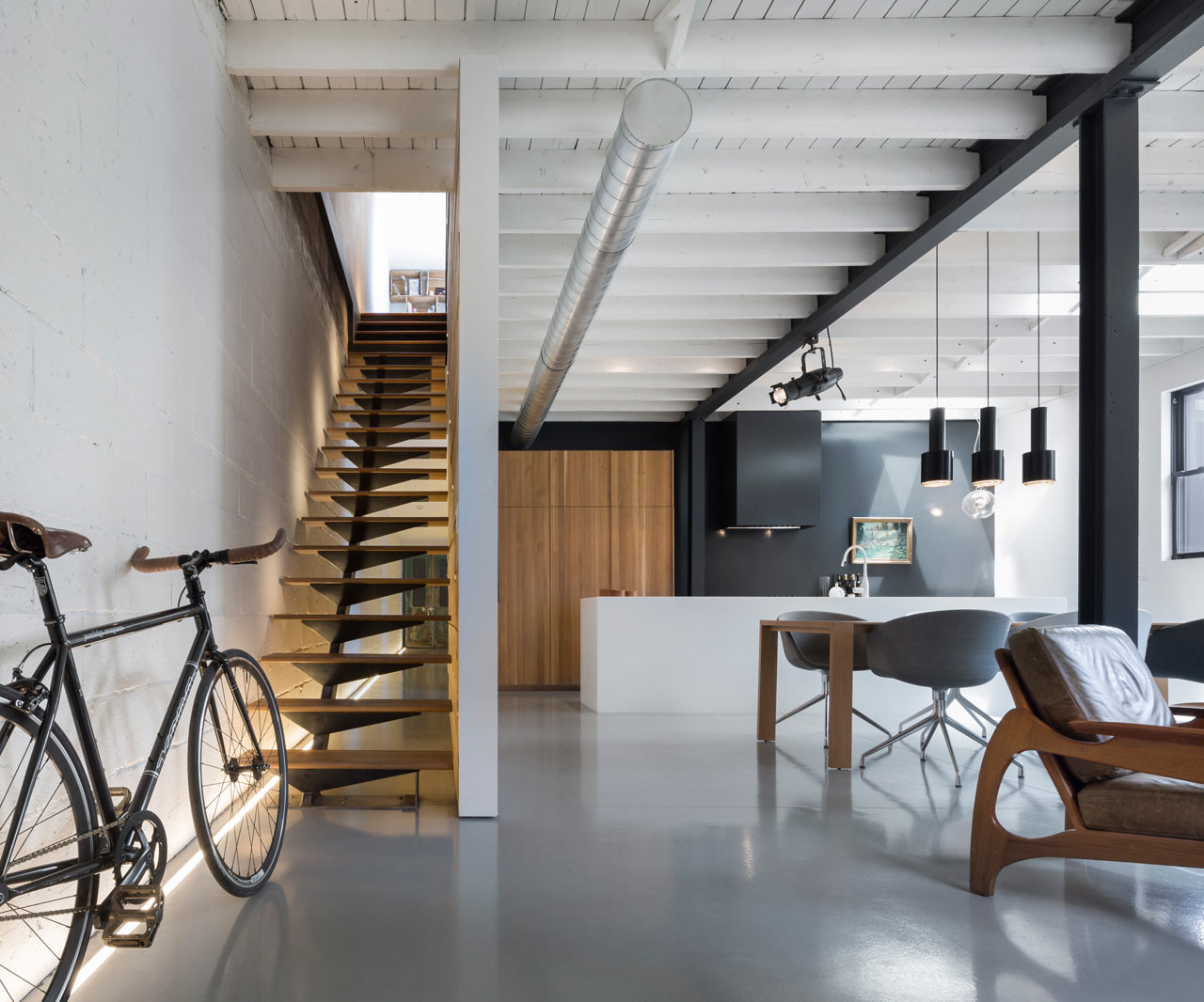 An old workshop in Montreal, Canada, is being transformed into a modern house by the Atelier Moderno company. In the 1950s inspired house lives a father with his two sons and a dog. The modern residence with its wide corridor and its open living room, doesn’t even remotely reminds of its old look. The ceilings of the house which remain exposed and painted white and the skylights give access to the natural daylight to enter the house, something that lowers the lighting costs. The use of wood and the earth-y tones, paired with black and shades of grey, create a sense of warmth in the rather minimal house. The stainless kitchen appliances and the white kitchen island give a contemporary look in the interior space. The designers have taken advantage of every single space of the house by even creating a green roof terrace, where the residents can have access to by the single staircase.