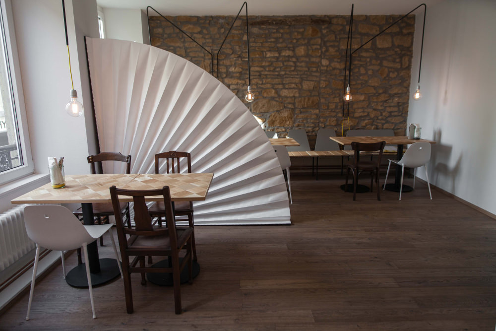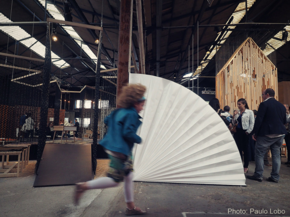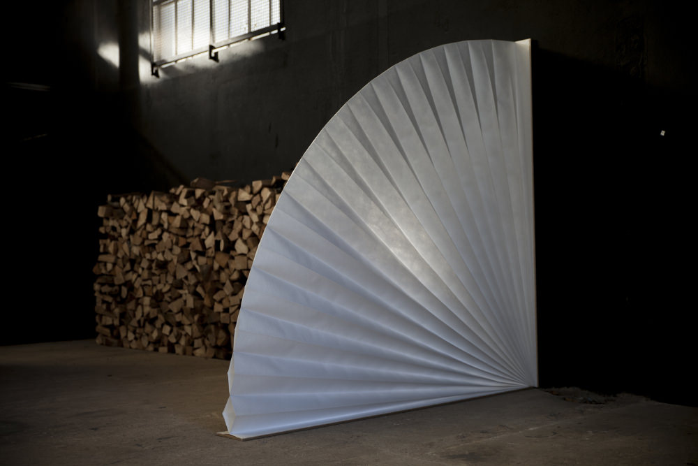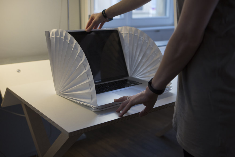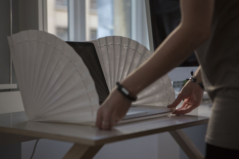 It can be carried around, and has the size of a folder, where you can stock your laptop and personal stuff, like a handbag. And then, there is the bench, that once opened,unfolded, turns into a couch. And last but not least, the room divider, which can look either like a plied sheet of paper, or like fan, and can be used whenever in need of some privacy.