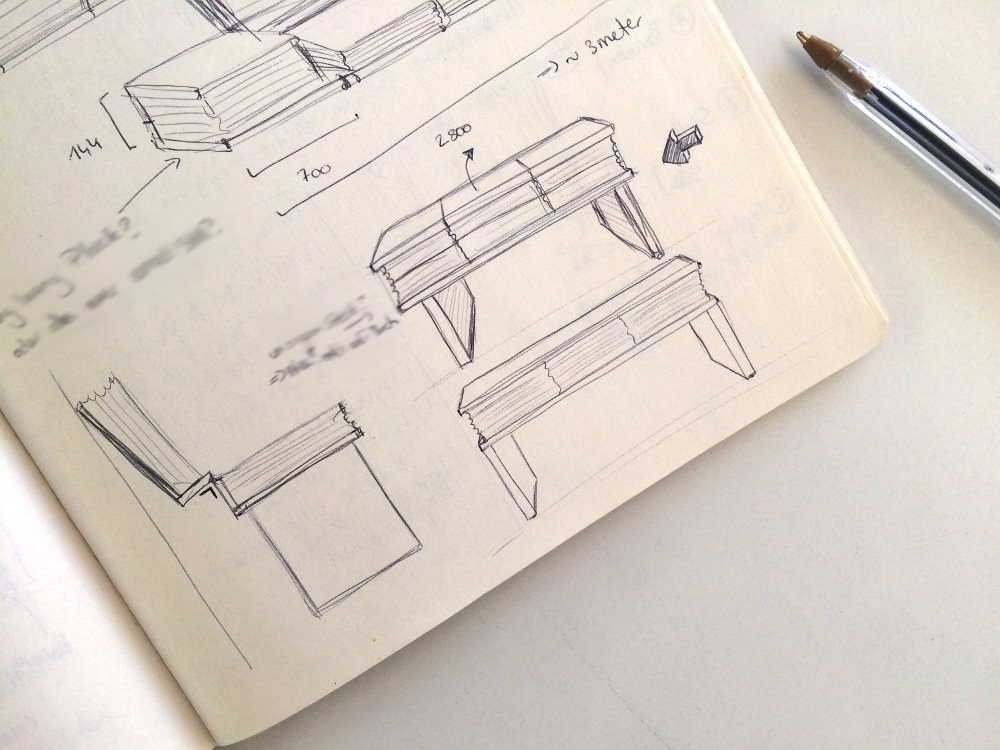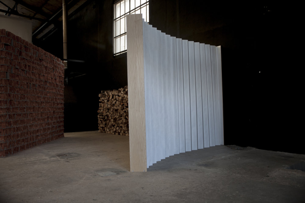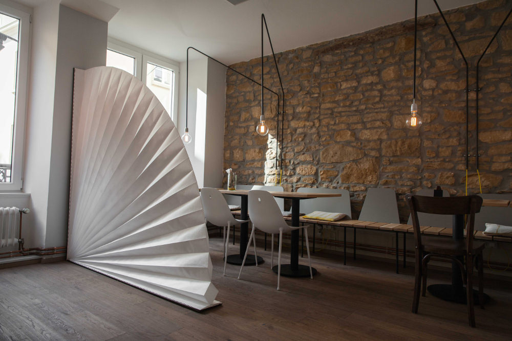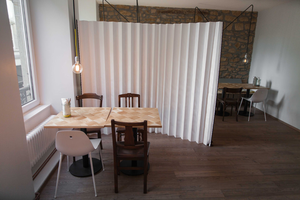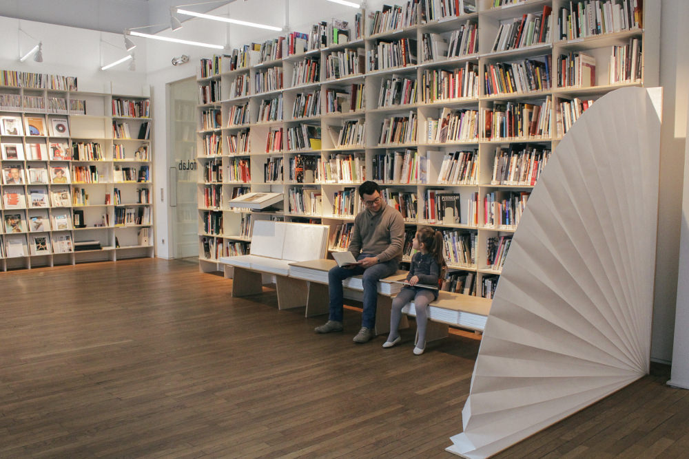 It can be carried around, and has the size of a folder, where you can stock your laptop and personal stuff, like a handbag. And then, there is the bench, that once opened,unfolded, turns into a couch. And last but not least, the room divider, which can look either like a plied sheet of paper, or like fan, and can be used whenever in need of some privacy.