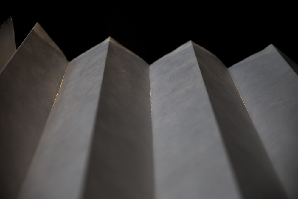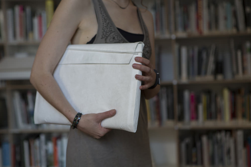 Julie Conrad is a young designer from Luxemburg. Inspired by the use of Tyvek, a nonwoven product consisting of spunbond olefin fiber, she has created the Unpaper collection, a resistant, transparent and pliable “fabric”, which can take shape like an accordion.