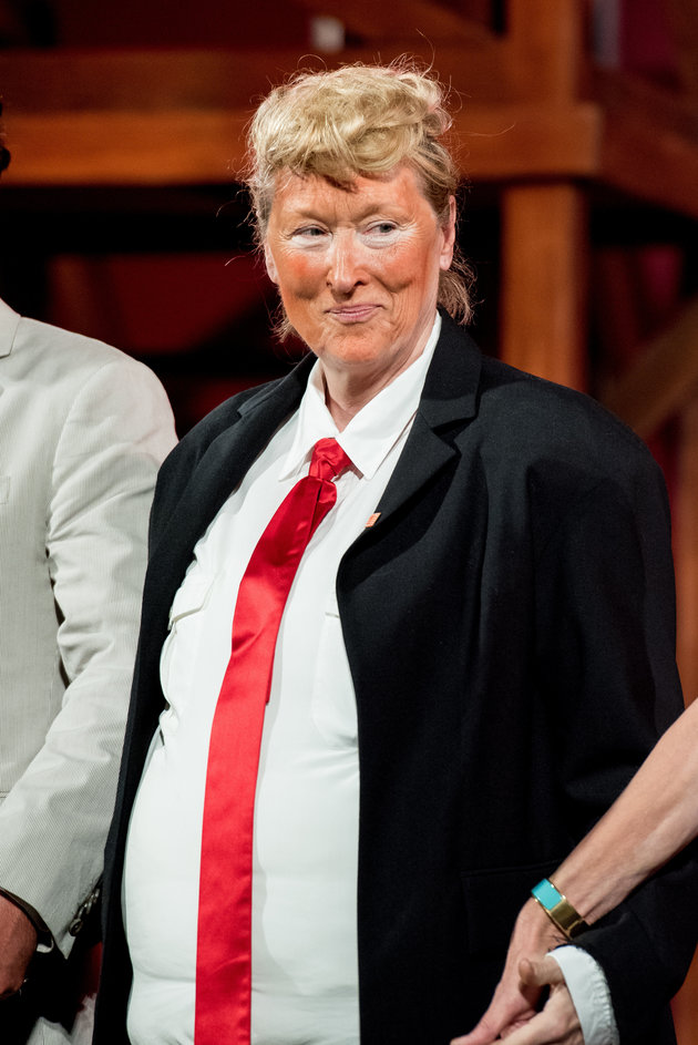 In case you thourght Miranda Priestley was the worst role Meryl Streep has portrayed, then it’s about time you found out the opposite. Her disguise into Donald Trump is all you must have expected: the yellow hair, the orange skin -thank solarium for that- and the big belly of the Republican candidate.