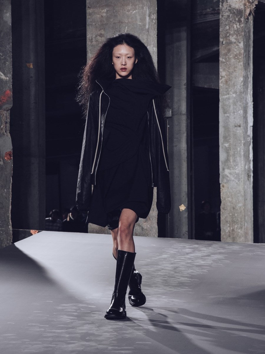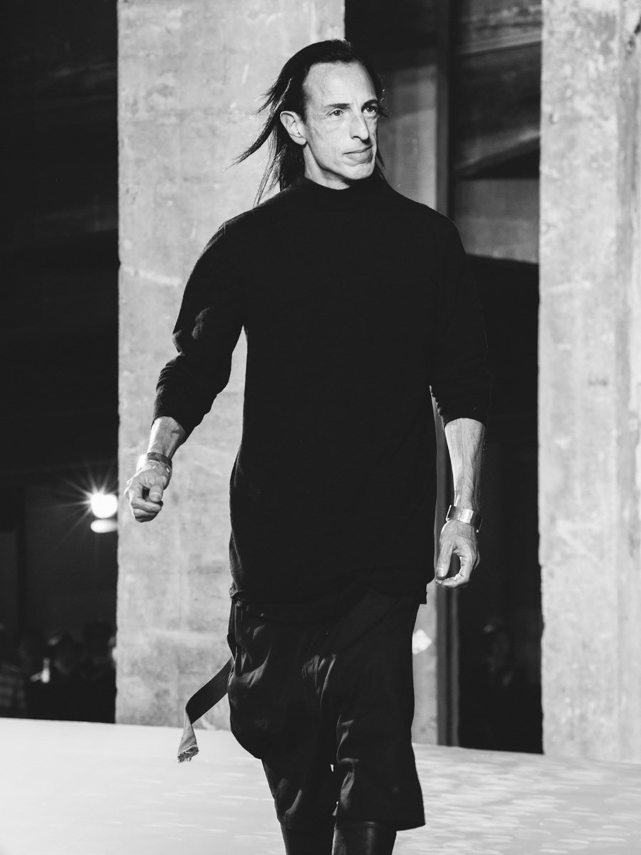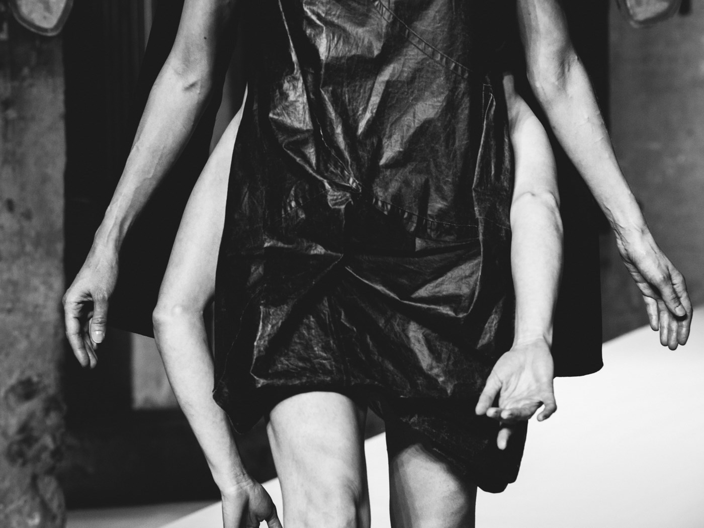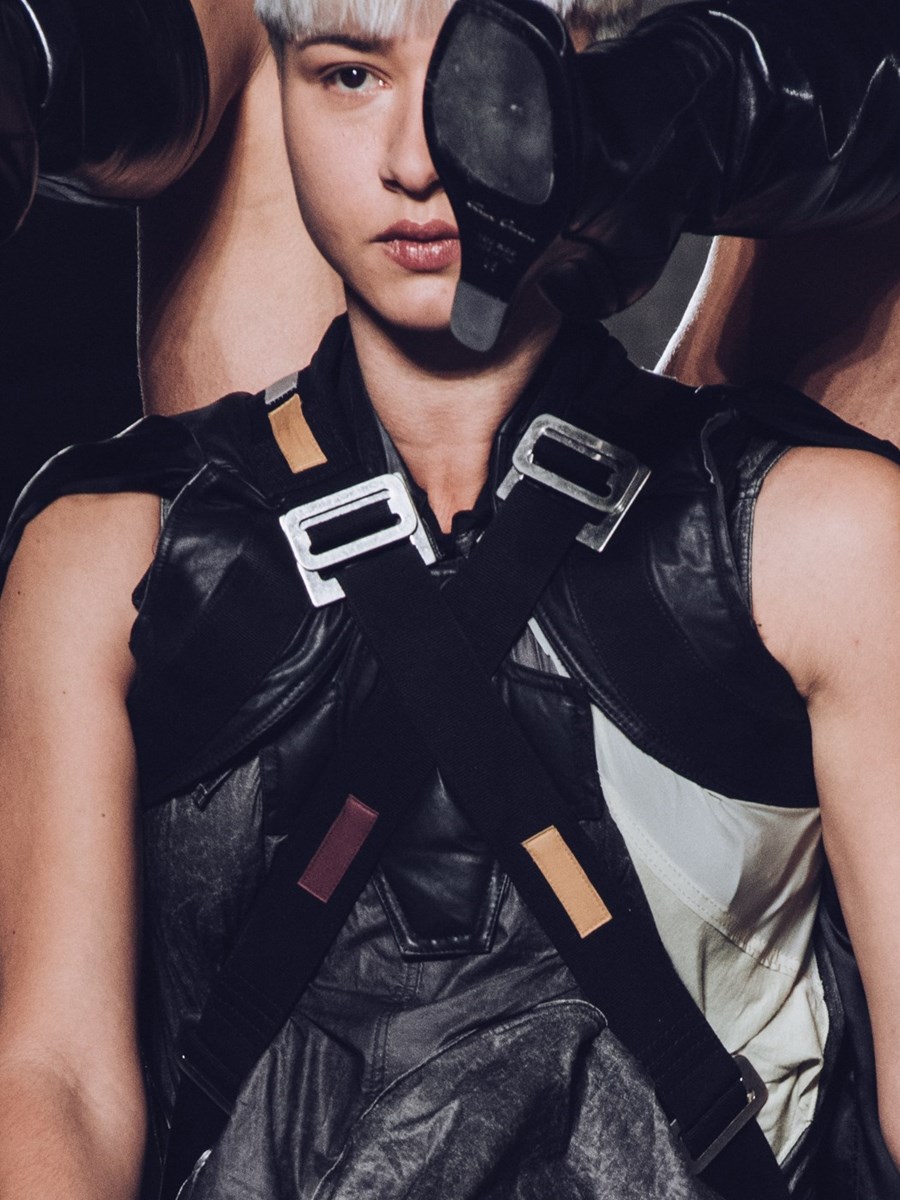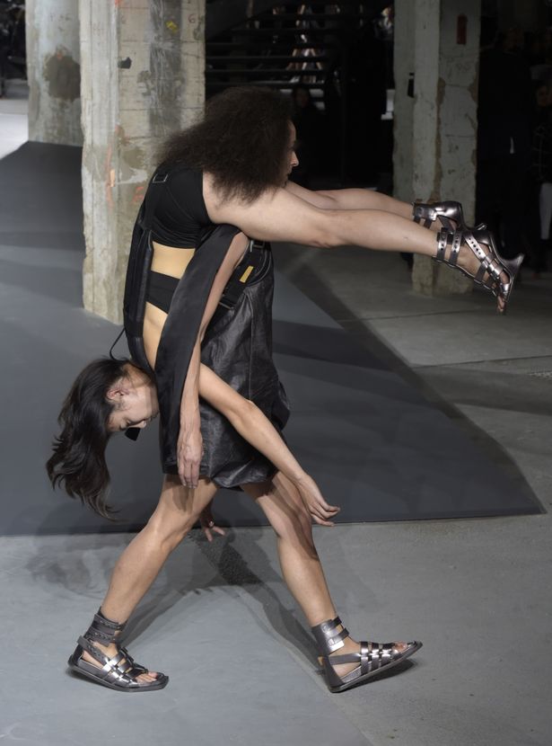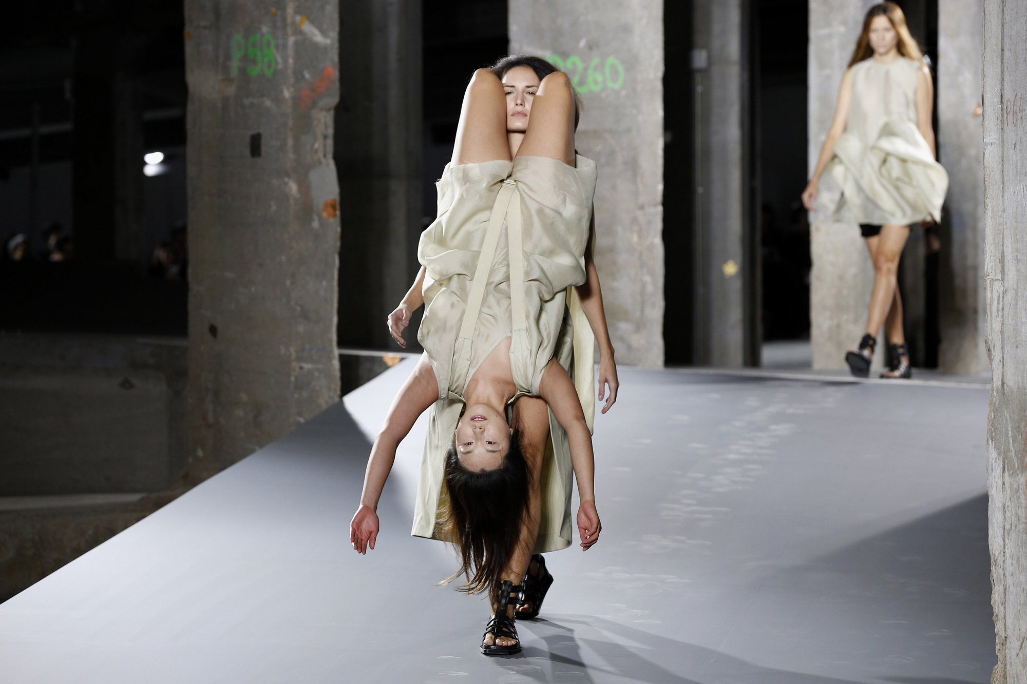 Each Rick Owens show seems to surpass the previous one. Today at his Paris Fashion Week show, models came down the runway with other women strapped upside-down to their bodies, their limbs hanging limply. These people were tied to their torsos like rucksacks.