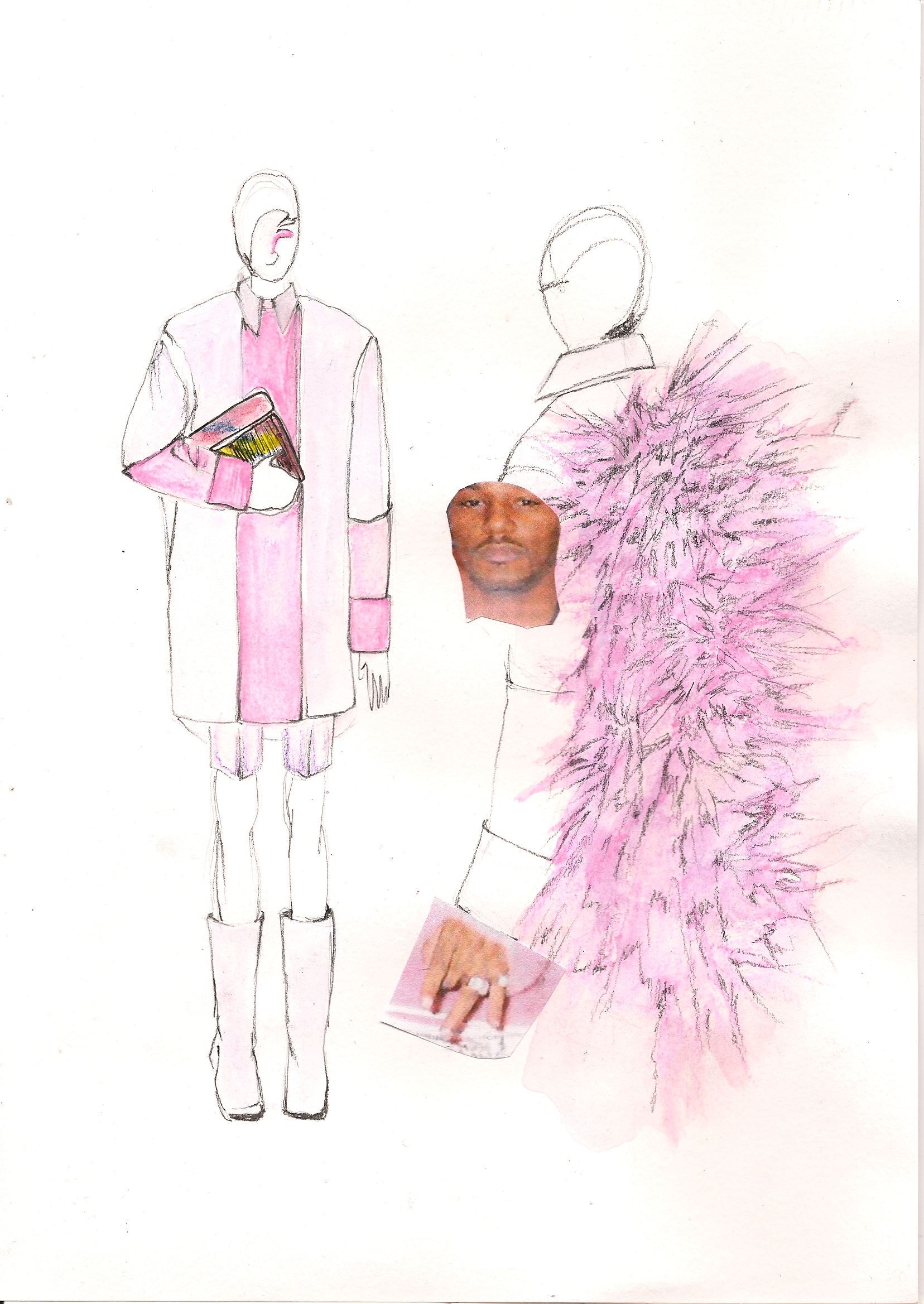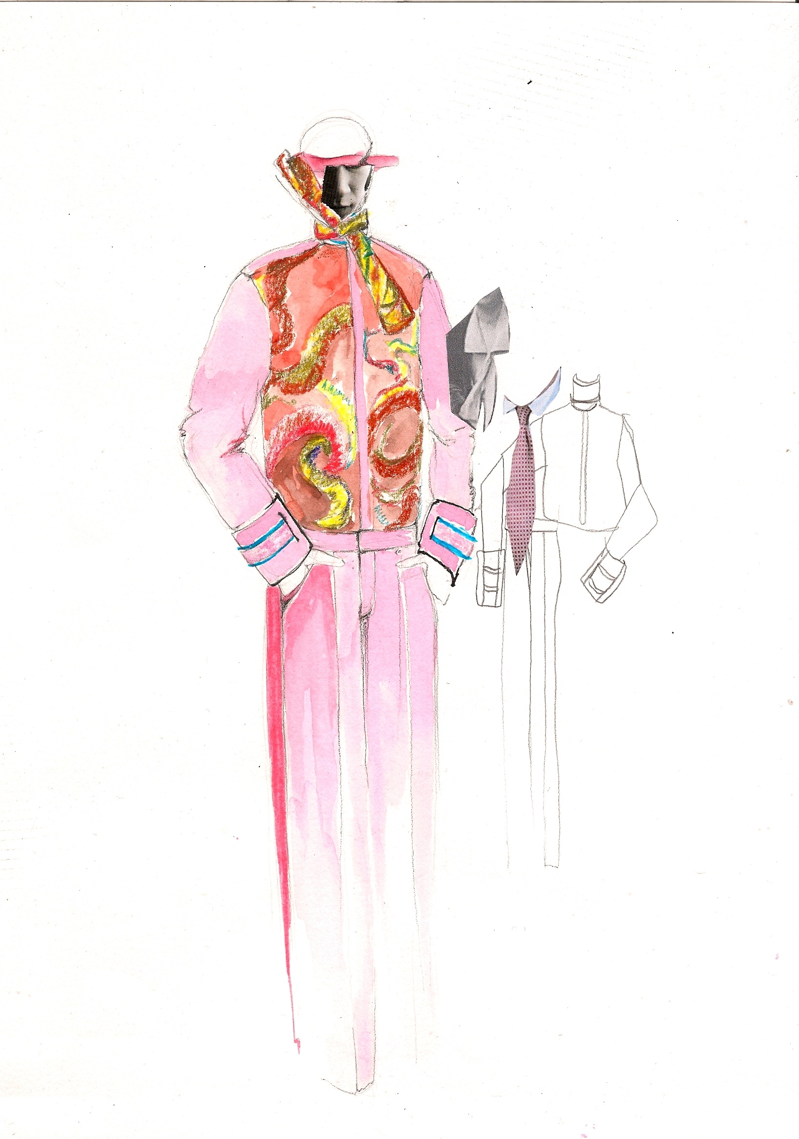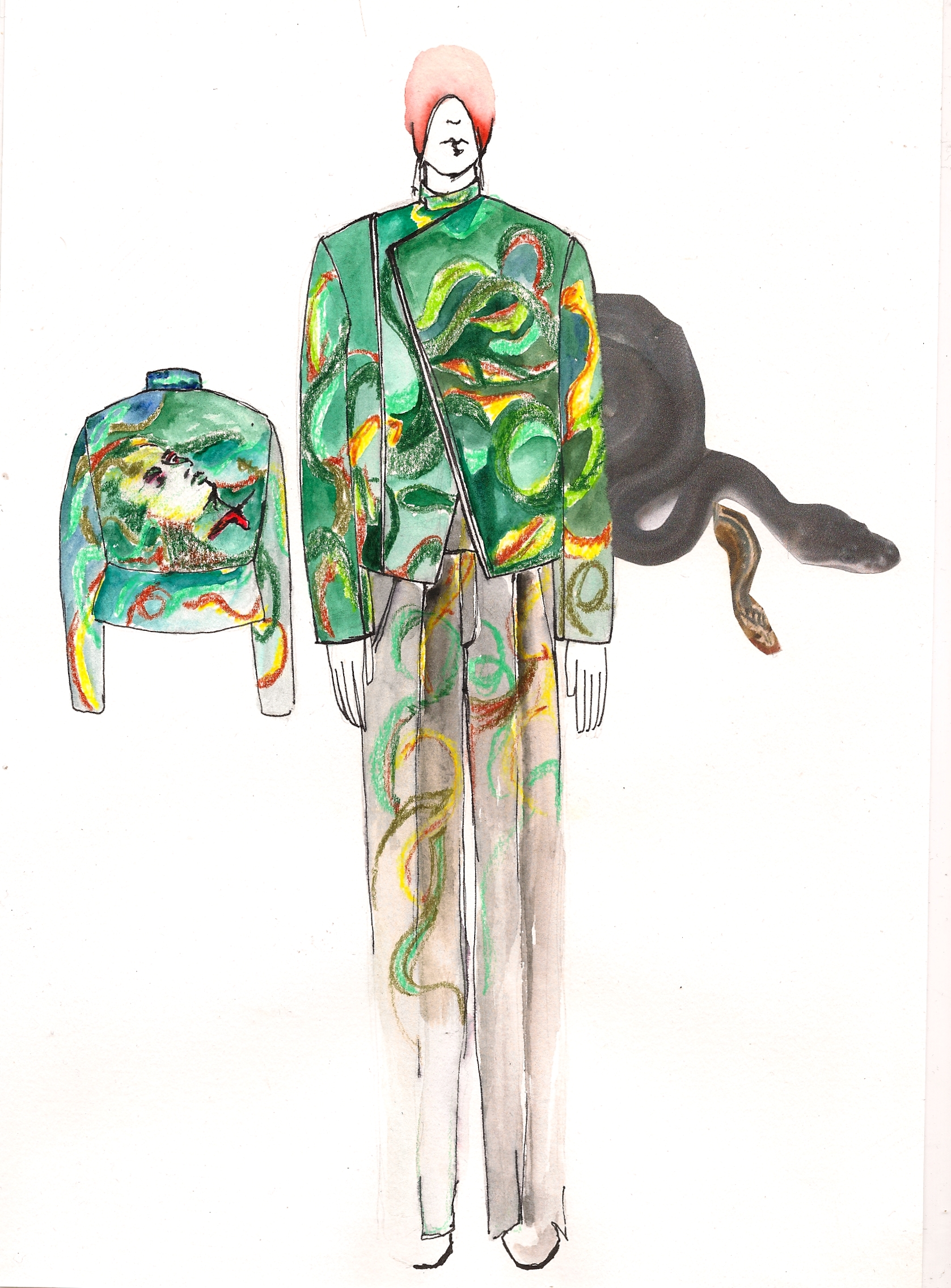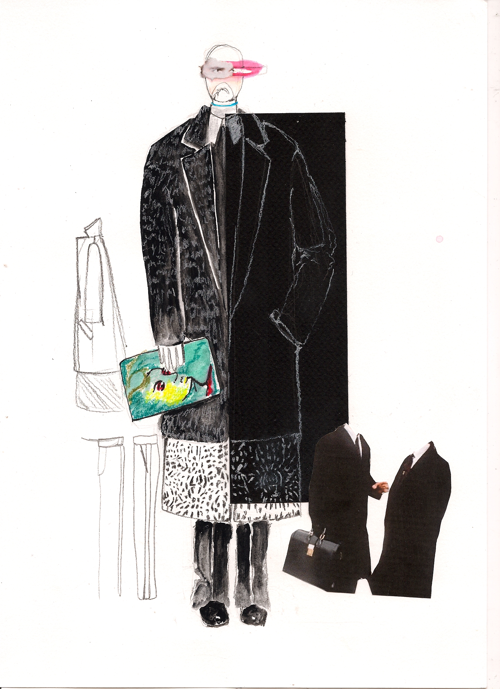 I tried to bring a more minimal, sophisticated look in a contrast using baroque prints of Rubens on mesh PVC, techno organza and other synthetic materials as well as luxurious fur garments dyed in bright colors. I tried to confront fake with luxury and bring fur in a new sense of contemporary menswear, not just use it as outerwear. Briefcases were replaced by envelope clutches, ties were bound like judo belts and biker boots in pop colors paid tribute to those awfully dressed men wearing square toe shoes. Shape-wise, the collection is influenced by 1990’s R’n’B music videos such those byTLC, giving the look a slightly oversized and sporty feel (crop tops, low waisted trousers, track suits) always questioning -with every silhouette- whether I would wear it myself or not. The main aspect of my graduation collection was that I wanted to create something more grown up, (garment wise) less fairy like and question contemporary menswear in the sense of how I would like to push it forward.