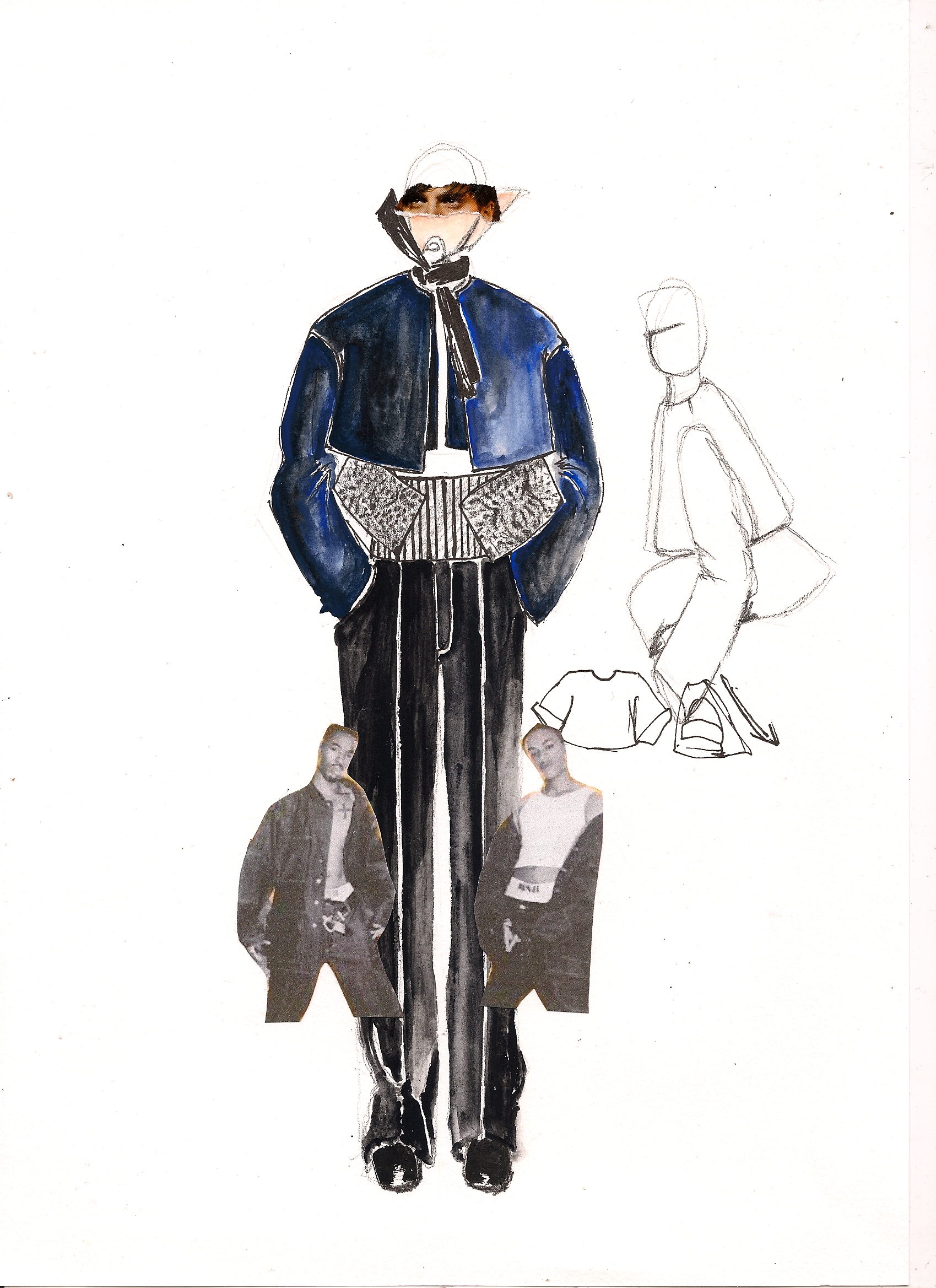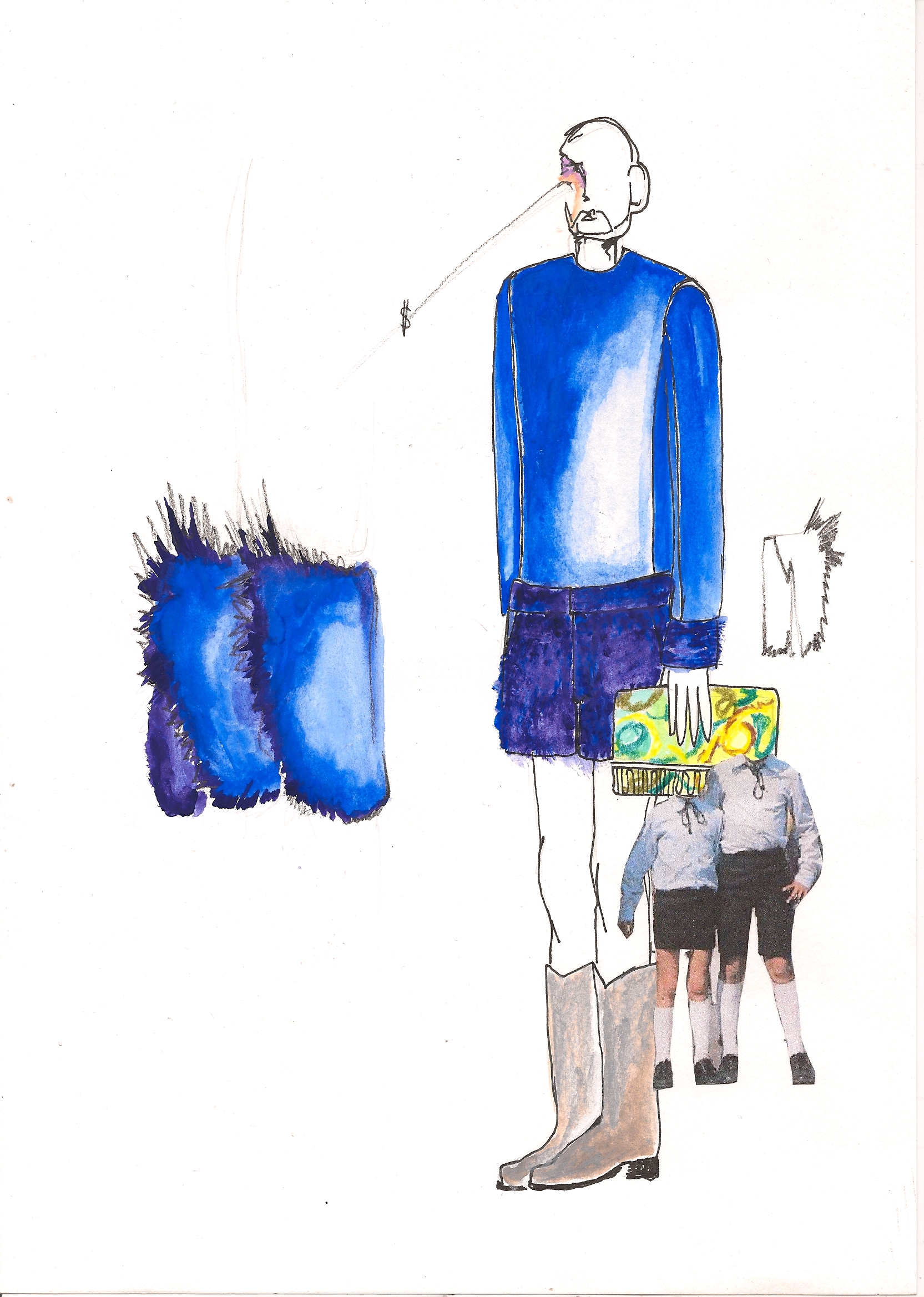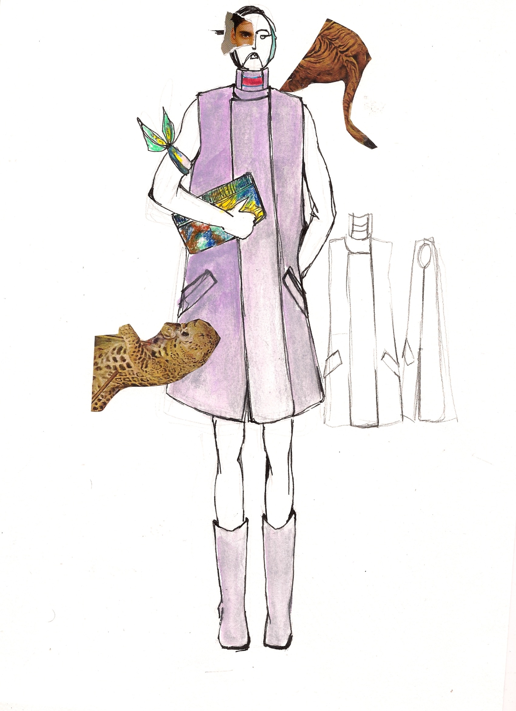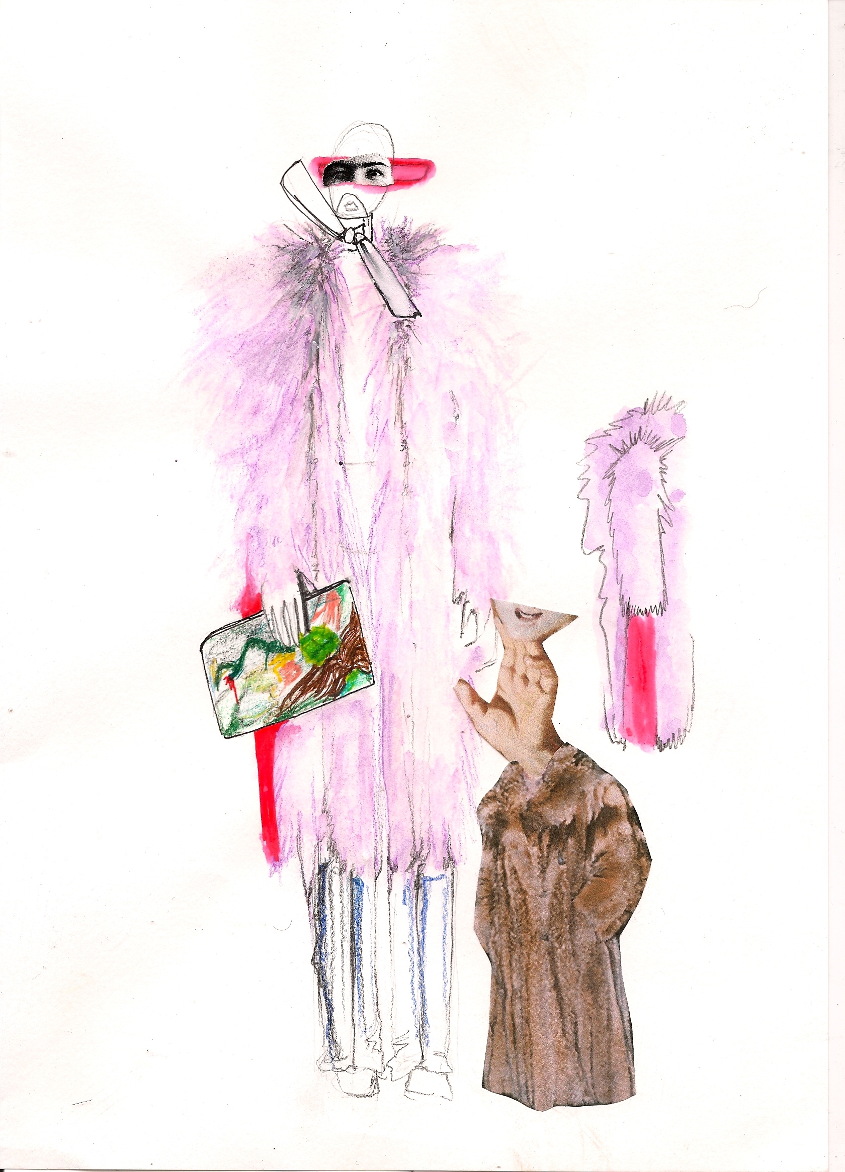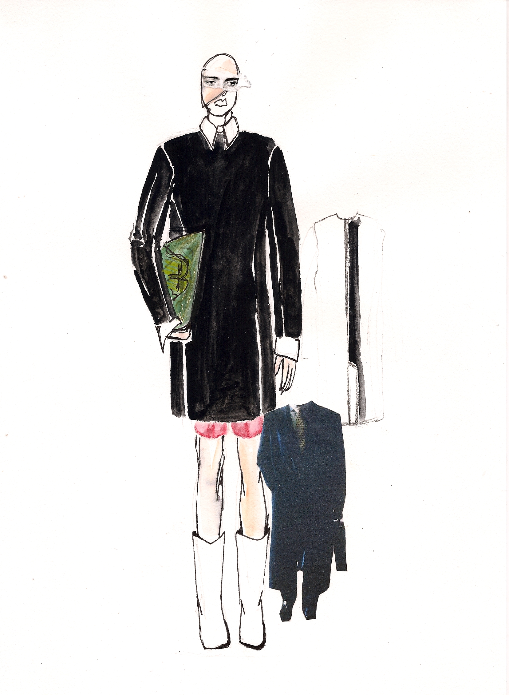 I tried to bring a more minimal, sophisticated look in a contrast using baroque prints of Rubens on mesh PVC, techno organza and other synthetic materials as well as luxurious fur garments dyed in bright colors. I tried to confront fake with luxury and bring fur in a new sense of contemporary menswear, not just use it as outerwear. Briefcases were replaced by envelope clutches, ties were bound like judo belts and biker boots in pop colors paid tribute to those awfully dressed men wearing square toe shoes. Shape-wise, the collection is influenced by 1990’s R’n’B music videos such those byTLC, giving the look a slightly oversized and sporty feel (crop tops, low waisted trousers, track suits) always questioning -with every silhouette- whether I would wear it myself or not. The main aspect of my graduation collection was that I wanted to create something more grown up, (garment wise) less fairy like and question contemporary menswear in the sense of how I would like to push it forward.