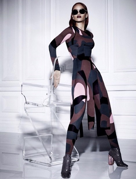In the photos, which will be presented inside the new issue of the Dior magazine, she is wearing a mesh dress with latex boots, or an abstract print animal bodysuit. Both looks are featured in Raf Simons‘ FW15 collection for Dior.