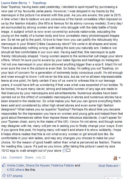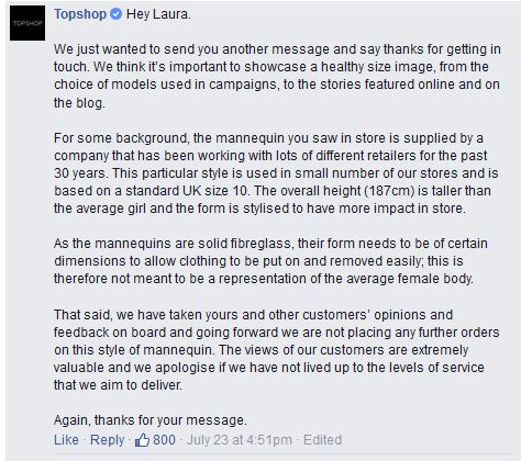 This is not something we are the only ones to have noticed. Laura Berry has done so, too and has decided to get in touch with Topshop, after visiting one of their shops to get her favourite Jamie Jeans. She was really bothered by the mannequin used though, that she decided to show it by getting in touch with the company, expressing her doubts about this controversial subject. “Perhaps it’s about time you became responsible for the impression you have on women and young girls and helped them feel good about themselves rather than impose these ridiculous standards.” posted Berry on Topshop’s Facebook page. The company soon, after that replied to her adding that this figure will no longer be used by them. And if you count how many times both the post and Topshop’s reply have been liked, then there are lots of people happy with that!