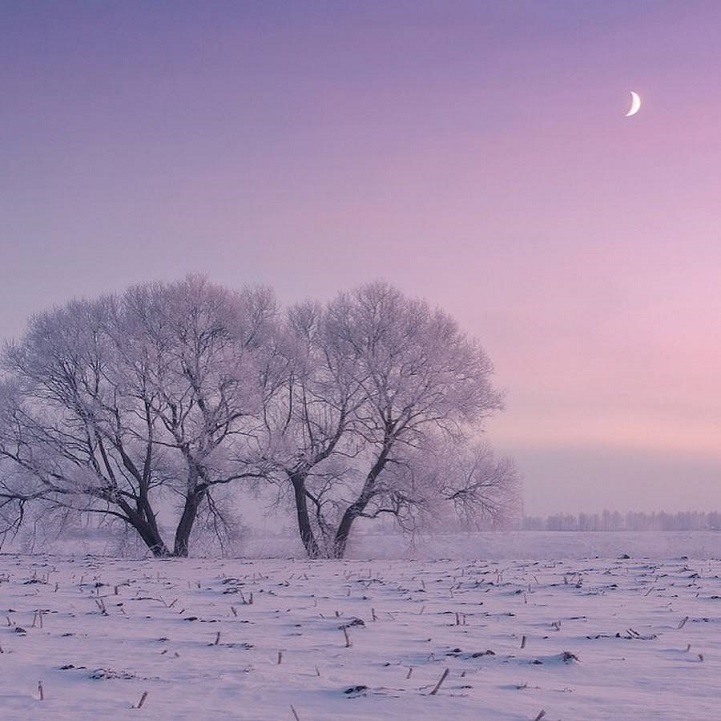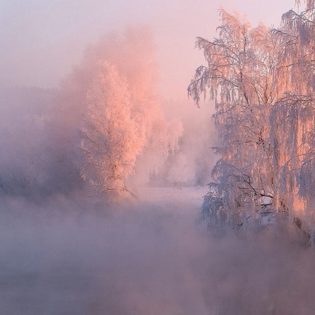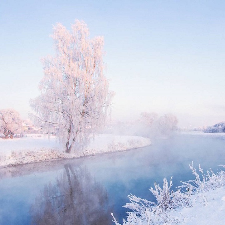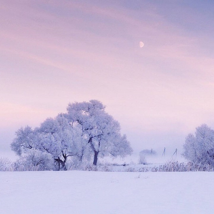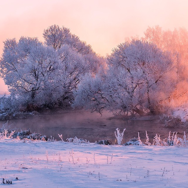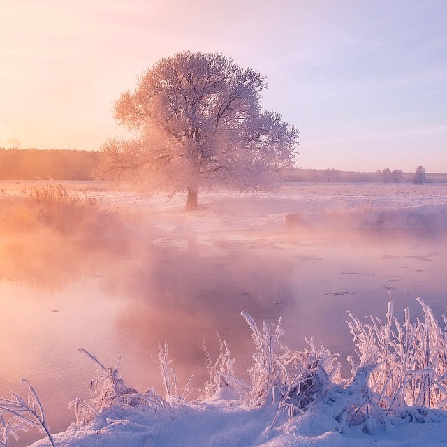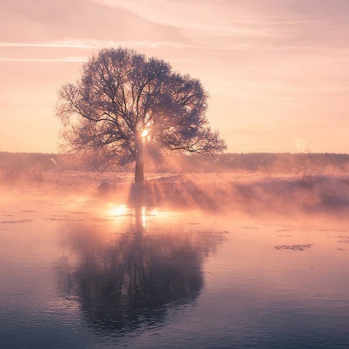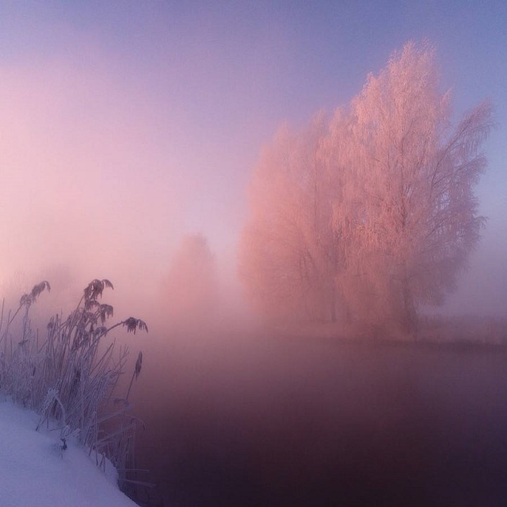 Winter mornings in Ugalnikov’s Belarus are pink and blue due to its frozen landscapes bathed in sunrise light. The fog and the reflections of the trees resemble a painting. His photos are ethereal, warm – even though it is winter, sensuous, they are not restricted to geographic boundaries and cannot help impressing us with the simplicity of their frame.