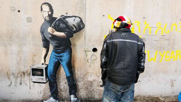 These murals in the camp of Calais portray Steve Jobs as a refugee (as Banksy himself once wrote on his site: “Apple exists only because US authorities allowed in a young man from Homs, Syria”), a shipwreck with survivors – his own variant of the famous painting “The Raft of the Medusa” by Theodore Gericault (“We are not all on the same boat” Banksy said) and a child with a vulture on a telescope, trying to find Britain.